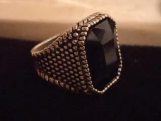 Bonito anillo tipo sello de gran tamaño. Presenta un diseño con detalles texturizados en la banda y una piedra central facetada de color negro. - Diseño tipo sello. - Piedra central grande y facetada. - Banda con textura.