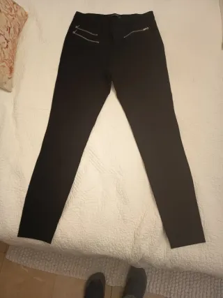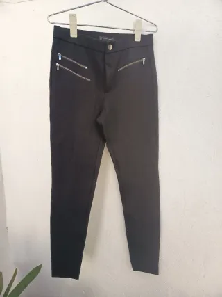 Pantalón pitillo de corte ajustado. Presenta un diseño moderno con detalles de cremalleras. - Dos cremalleras decorativas en la parte delantera. - Bolsillos laterales.