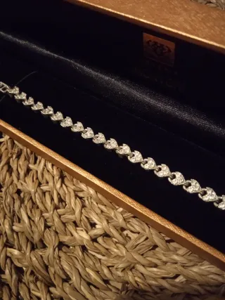 Bonita pulsera con un diseño de corazones adornados con brillantes. Un accesorio elegante y llamativo. - Diseño de corazones entrelazados. - Detalles con brillantes. - Acabado plateado.