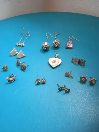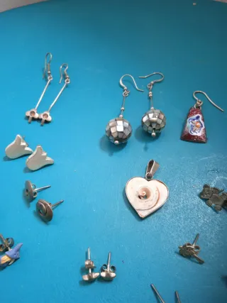 Conjunto de varias piezas de joyería de plata, con un estilo característico de los años 80. - Pendientes largos con detalles florales. - Pendientes de bola con incrustaciones. - Colgante con forma de corazón y espiral. - Pendientes con forma de flor. - Pendientes con forma de estrella. - Pendientes con forma de pájaro. - Pendientes con forma de oso. - Colgante con forma de campana esmaltada.