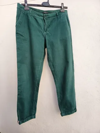 Pantalones de tela en color verde. - Cintura con trabillas para cinturón. - Cierre de botón y cremallera. - Bolsillos laterales. - Dobladillo en los bajos.