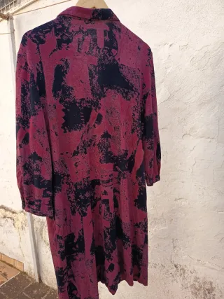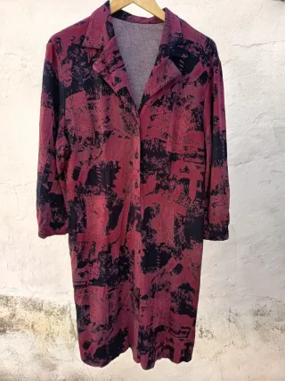 Vestido vintage de talla única, con un diseño único hecho a mano. Su estampado abstracto en tonos rojos y negros le da un toque artístico y original. - Diseño de corte largo. - Cuello tipo solapa. - Cierre de botones.
