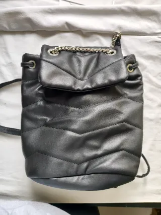 Mochila de Bershka con un diseño acolchado y detalles plateados. - Medidas aproximadas: Alto: 28 cm aprox // Ancho: 26 cm aprox - Bolsillo pequeño trasero interior con cremallera. - Cierre de cordón e imán. - Correas ajustables. - Acabado metalizado.