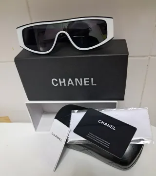 Gafas de sol de diseño moderno. - Montura blanca con detalles negros. - Lentes oscuras. - Incluye caja, funda y paño de limpieza.