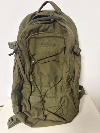 Mochila de estilo militar con capacidad de 21 litros. - Fabricada en resistente material Cordura. - Color verde oliva. - Compartimento principal espacioso. - Múltiples correas MOLLE para sujeción adicional. La mochila está prácticamente nueva, no ha sido usada.