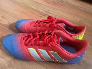 Zapatillas de fútbol Adidas Messi con un diseño degradado de azul a rojo. - Talla 45 - Tres rayas plateadas características de Adidas en el lateral. - Detalle amarillo en el talón.