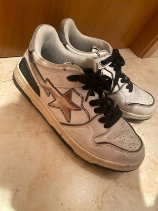 Zapatillas BAPE Bapesta con detalles en oro y blanco. - Diseño icónico de BAPE. - Cordones negros. - Logo de BAPE en la lengüeta.