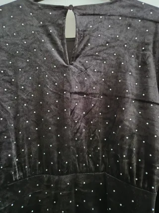 Elegante vestido negro con un diseño único. - Tejido de terciopelo. - Adornado con pequeños detalles brillantes. - Manga larga. - Cintura marcada. - Falda con drapeados y volumen.