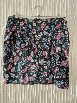 Falda corta con estampado floral vibrante sobre fondo negro. - Diseño con flores en tonos rosas, azules y blancos. - Tejido con textura aterciopelada. - Corte recto y favorecedor.