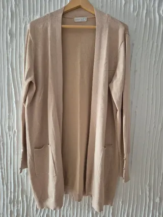 Cárdigan largo de punto en color beige. Es una prenda cómoda y versátil. - Diseño abierto. - Dos bolsillos frontales. - Puños con detalle de botones.