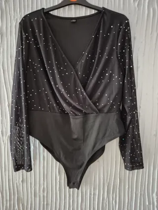 Elegante body negro con un diseño de pedrería plateada que aporta un toque de brillo. - Mangas largas de malla transparente. - Escote cruzado. - Detalle de pedrería brillante.