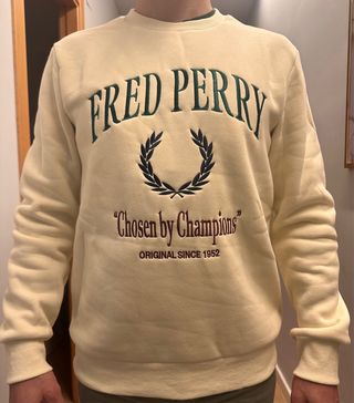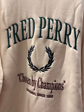 Sudadera de Fred Perry con un diseño clásico. - Color beige principal con detalles en verde. - Logo bordado de Fred Perry. - Estampado Chosen by Champions y Original Since 1952.