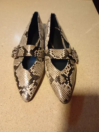 Elegantes zapatos planos con estampado de serpiente y detalle de hebilla. - Diseño de punta afilada. - Tira con hebilla metálica. - Estampado de serpiente en tonos beige y gris.