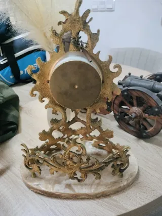 Elegante reloj de sobremesa con un diseño ornamentado y base de mármol. - Estructura metálica dorada con detalles intrincados. - Base ovalada de mármol veteado.