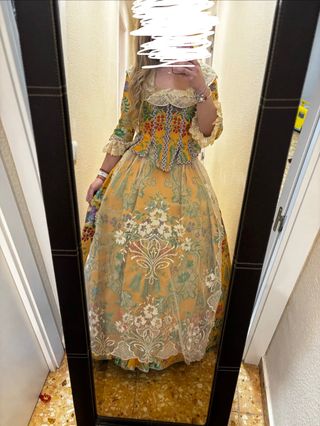 Traje de fallera para adulta con un diseño vibrante y detallado. - Diseño floral y geométrico. - Mangas con volantes de encaje. - Cuello adornado con encaje. Color ocre ( falta plancharlo )