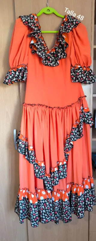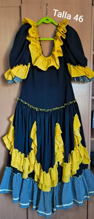 Conjunto de tres batas rocieras con un diseño vibrante y alegre. - Diseño con volantes y estampado floral. - Mangas abullonadas con detalle de volantes. - Falda con múltiples capas y adornos. - Estampado de flores y lunares. Conjunto de tres batas rocieras. - Diseño ligero y colorido Las 3 batas rocieras 150 euros. Individual cada una 70 euros. Precio fijo