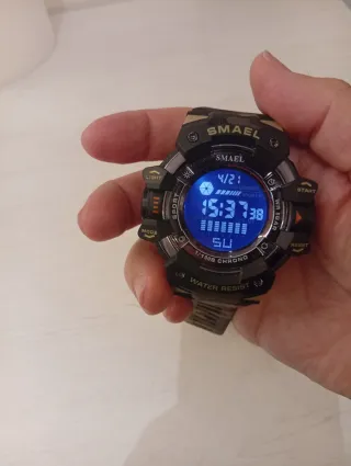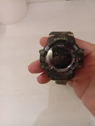 Reloj SMAEL con un diseño deportivo y militar, ideal para actividades al aire libre. Su correa de camuflaje le da un toque único. - Esfera digital con luz. - Resistente al agua (Water Resist). - Funciones de cronómetro (Chrono) y alarma.
