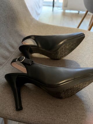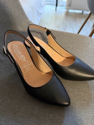 Elegantes zapatos de tacón de la marca Chamby. - Color negro. - Diseño slingback con tira al talón. - Punta fina. - Detalle de plantilla Comfort Gel para mayor comodidad. - Tacon 8 cm