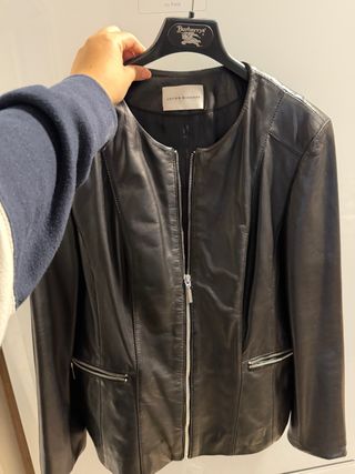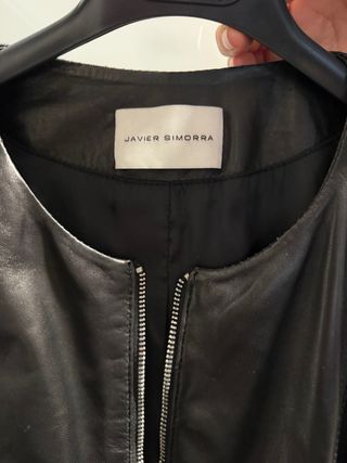 Elegante chaqueta de piel negra de Javier Simorra. Un básico atemporal para cualquier armario. - Cierre de cremallera frontal. - Bolsillos con cremallera en la parte inferior. - Diseño con cuello redondo. - entalla un poco mas pequeña