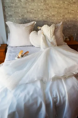 Elegante vestido de novia de la colección 2025. Un diseño que combina detalles delicados y una silueta favorecedora. - Cuerpo con aplicaciones de encaje y pedrería. - Falda voluminosa con varias capas de tul. - Escote corazón con tirantes finos. - Espalda con cierre de cordones.