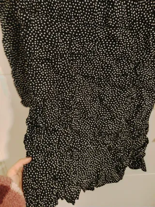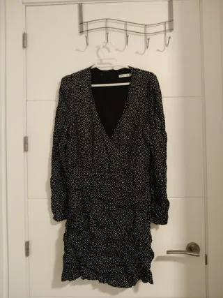 Vestido negro con estampado de lunares blancos. Tiene un escote pronunciado y manga larga. Diseño cruzado. Falda con volantes. Tejido ligero y con textura.