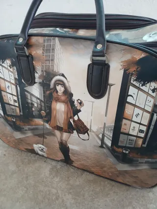 Maleta de viaje con un diseño artístico único que presenta una escena de anime. - Ilustración detallada de una chica paseando con su perro. - Fondo urbano con edificios y palmeras. - Asas de cuero sintético para un agarre cómodo.
