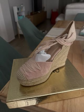 Elegantes zapatos de cuña con un diseño de tiras cruzadas y atadas al tobillo. La cuña está forrada de esparto, aportando un toque natural y veraniego. Estan sin usar - Material exterior: ante. - Cierre con cordones. - Cuña de esparto.