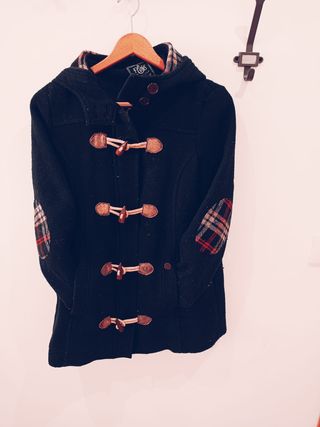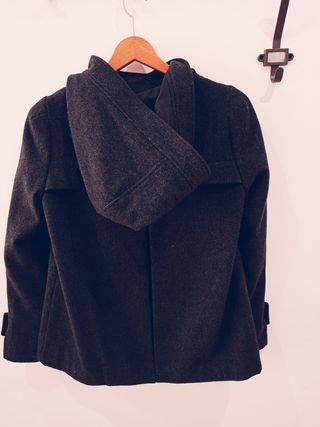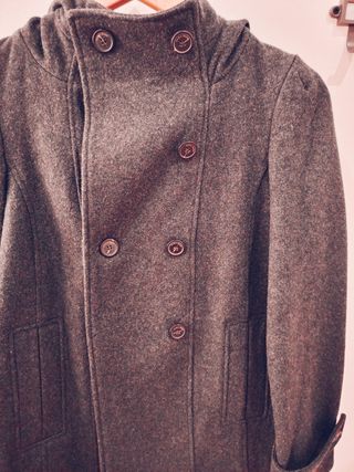 Chaqueta de paño con capucha y cierre de botones. - Diseño de doble botonadura. - Color gris - Perfecto estado (se ha usado muy poco) - Capucha - Bolsillos frontales. - Puños con detalle.