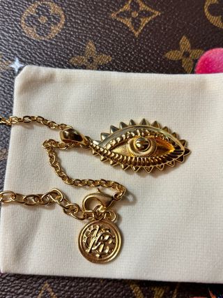 Elegante collar con colgante de ojo y charm. - Diseño llamativo con forma de ojo. - Detalle de charm circular con logo. - Cadena dorada con cierre de mosquetón.
