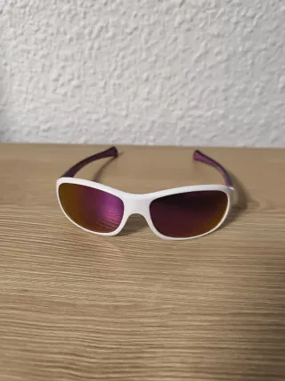 Gafas de sol deportivas con un diseño moderno y lentes espejadas. Talla infantil, 6-10 años, modelo MH T500 - Montura blanca. - Varillas en color rosa. - Lentes con reflejos rosados y anaranjados.