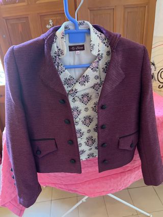Traje de Torrentí de la marca Llorca. - Talla 14. - Color morado. - Diseño con estampado floral en el chaleco. - Está en perfecto estado. Le falta la tapicería de un botón, pero esta detrás de la chaqueta y no se ve.