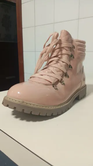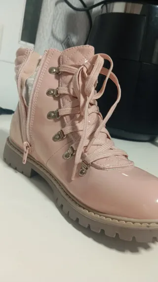 Botas de charol en color rosa, con un diseño moderno y detalles acolchados. - Cierre de cremallera lateral. - Cordones decorativos. - Suela gruesa y resistente.