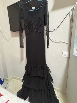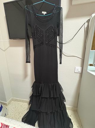 Traje de flamenca elegante, usado solo dos veces. Incluye un mantón a juego. - Diseño con detalles de pedrería en el corpiño y escote. - Mangas largas de tejido de malla transparente. - Falda con volantes escalonados. - Cierre de cremallera lateral.