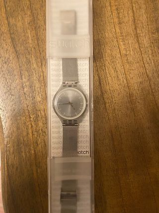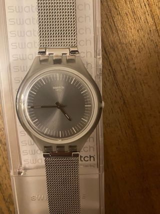 Reloj Swatch Skin Irony original en color plata. Caja ultrafina de acero inoxidable con esfera plateada y diseño minimalista. Correa de malla milanesa (stainless steel) muy cómoda y elegante. Fabricado en Suiza (Swiss Made). Incluye caja original de Swatch. Estado muy bueno, apenas usado y bien cuidado. Funciona perfectamente. Ideal tanto para uso diario como para ocasiones elegantes. Se puede entregar en mano o enviar por Wallapop.
