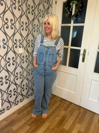 Peto vaquero de la marca NOON. - Diseño de pierna ancha. - Bolsillos delanteros y traseros.