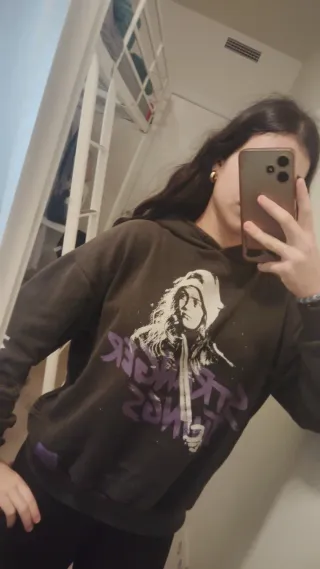 Sudadera con estampado de Stranger Things, personaje Max. - Diseño frontal con personaje y texto. - Capucha sin cordones
