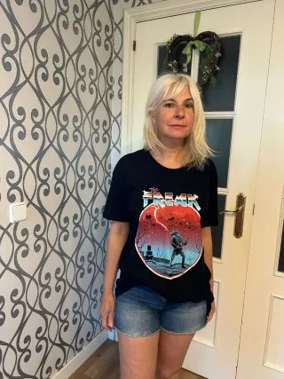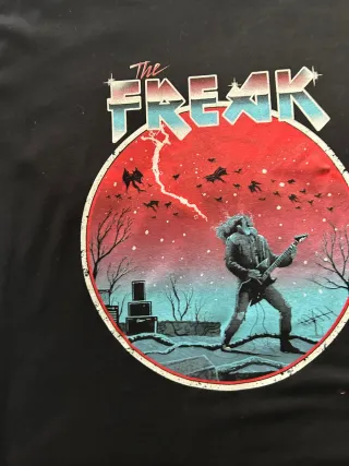 Camiseta negra con estampado inspirado en Eddie Munson de Stranger Things. - Diseño frontal con gráfico. - Manga corta. - Cuello redondo.