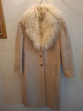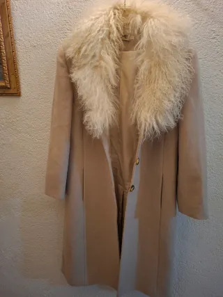 Elegante abrigo largo en tono beige, perfecto para ocasiones especiales o para el día a día. - Cuello de pelo sintético - Cierre de botones - Bolsillos laterales.El cuello se puede quitar o poner ,lleva botones. Pone talla 42 pero es pequeña. De hombro 42 , busto 49 ,manga 54 y largo 100