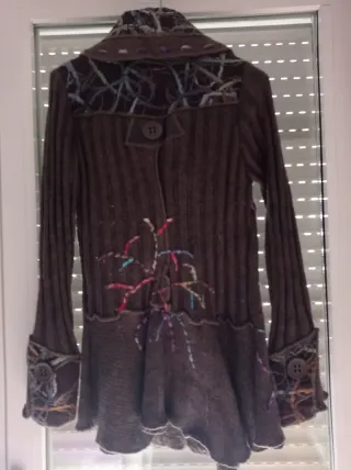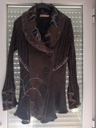 Chaqueta de punto con un diseño original y detalles coloridos. - Cuello amplio con bordado. - Cierre cruzado con botones. - Mangas largas con puños decorados. - Adornos bordados en la parte delantera y en los puños.