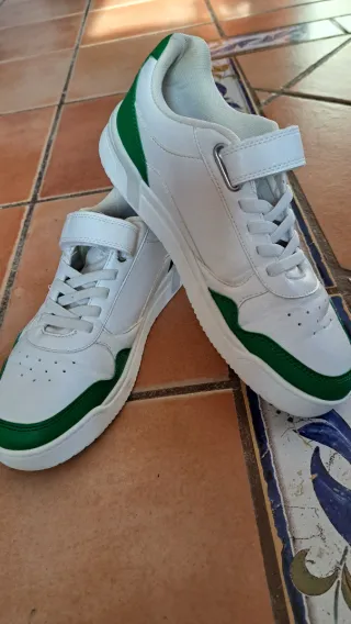 Zapatillas deportivas de estilo casual con detalles en verde. - Cierre con cordones y velcro. - Diseño moderno con perforaciones en la puntera. - Suela blanca de goma.