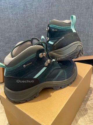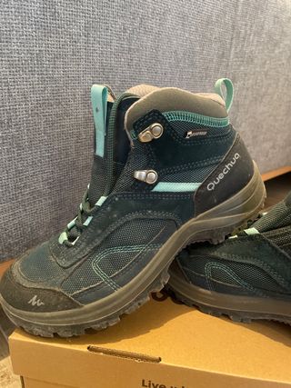 Botas de montaña Quechua en color azul y verde azulado, talla 37. - Diseño de caña media. - Cierre con cordones. - Detalle de logo en el lateral. - Tirador trasero para facilitar su colocación.
