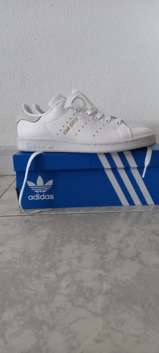 Zapatillas deportivas Adidas Stan Smith para mujer, talla 37. Ideales para un look casual y cómodo. - Diseño clásico y atemporal. - Cierre con cordones. - Detalle de Stan Smith en dorado.