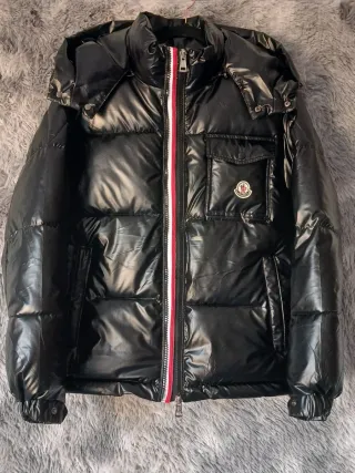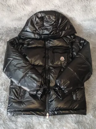 Chaqueta Moncler negra con acabado brillante y detalles de cremallera tricolor. - Capucha integrada. - Bolsillo frontal con logo. - Puños elásticos.