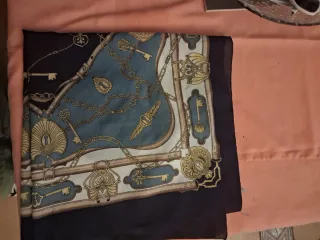 Pañuelo de seda Hermès con un diseño vibrante. - Material: Seda twill. - Colores: Naranja y rosa. - Viene con cajita de regalo. - Puedes elegir el que más te guste.