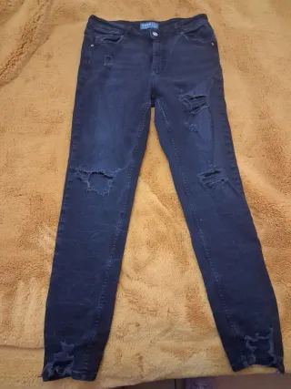 Pantalón vaquero de corte ajustado con un estilo moderno y desgastado. - Diseño con rotos. - Bajo deshilachado. - Cintura con trabillas para cinturón.