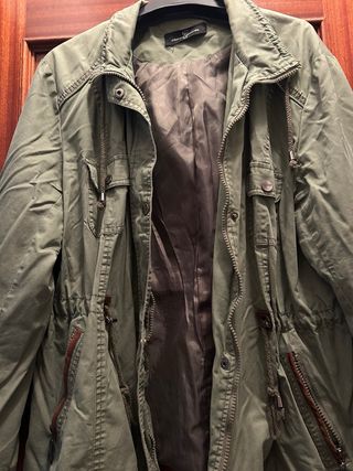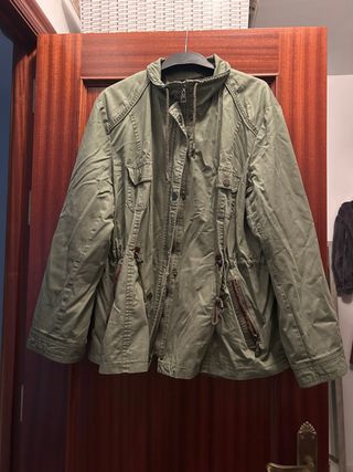 Parka estilo cortavientos en tono verde cacería. - Diseño con múltiples bolsillos. - Cordón ajustable en la cintura. - Cierre de cremallera y botones. - Cuello alto.
