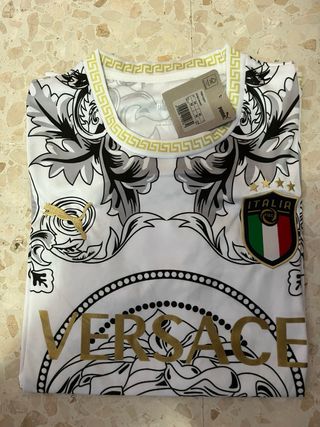 Camiseta de fútbol de Italia con un diseño exclusivo. - Diseño con estampado Versace. - Cuello redondo con detalle griego. - Escudo de Italia y logo de Puma.