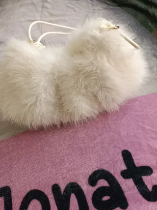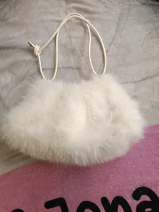 Bolso de pelo blanco. - Material: Pelo sintético. - Color: Blanco. - Asa: Cordón blanco.