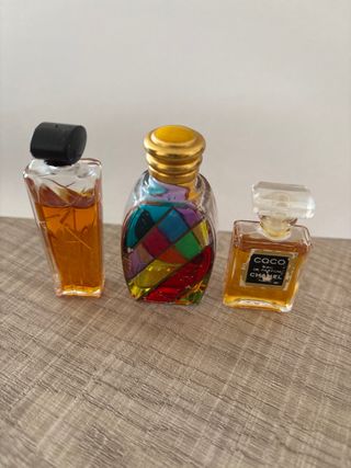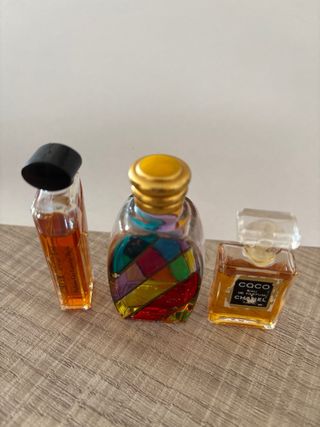 Conjunto de tres botellas mini de colonia, perfectas para decoración. - Botella con tapa negra y líquido ámbar de Guy - Botella con diseño de vidrieras y tapa dorada. - Botella de Chanel Coco con tapa transparente.