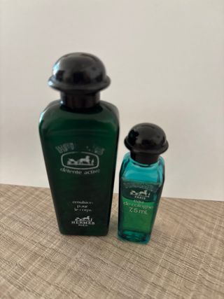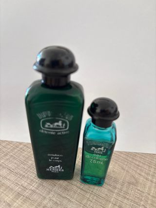Set de dos mini botellas de la marca Hermes. Una tiene las letras un poco borradas. - Una botella de eau de cologne de 7.5 ml. - Una botella de émulsion pour le corps con tapa negra. - Ambas botellas son de color verde.